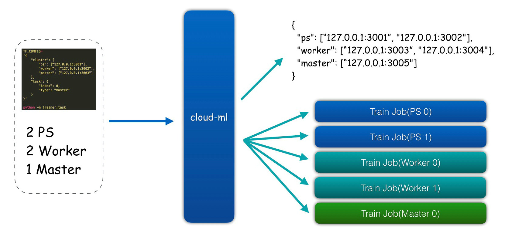 除了可以启动单个容器执行用户的训练代码,小米cloud-ml平台也支持TensorFlow的分布式训练,使用时只需要传入ps和worker个数即可。考虑到对TensorFlow原生API的兼容性,我们并没有定制修改TensorFlow代码,用户甚至可以在本地安装开源的TensorFlow测试后再提交,同样可以运行在云平台上。但本地运行分布式TensorFlow需要在多台服务器上手动起进程,同时要避免进程使用的端口与其他服务冲突,而且要考虑系统环境、内存不足、磁盘空间等问题,代码更新和运维压力成倍增加,Cloud Machine Learning下的分布式TensorFlow只需要在提交任务时多加两个参数即可。有人觉得手动启动分布式TensorFlow非常繁琐,在云端实现逻辑是否更加复杂?其实并不是,通过云服务的控制节点,我们在启动任务前就可以分配不会冲突的端口资源,启动时通过容器隔离环境资源,而用户不需要传入Cluster spec等繁琐的参数,我们遵循Google CloudML标准,会自动生成Cluster spec等信息通过环境变量加入到容器的启动任务中。这样无论是单机版训练任务,还是几个节点的分布式任务,甚至是上百节点的分布式训练任务,cloud-ml平台都可以通过相同的镜像和代码来运行,只是启动时传入的环境变量不同,在不改变任何外部依赖的情况下优雅地实现了看似复杂的分布式训练功能。