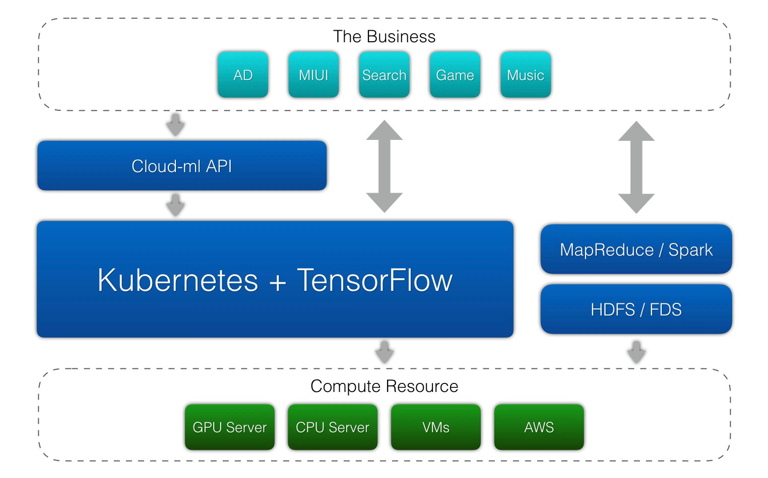 计算机领域有句名言“任何计算机问题都可以通过增加一个中间层来解决”。无论是AWS、OpenStack、Hadoop、Spark还是TCP/IP都是这样做的,通过增加一个抽象层来屏蔽底层资源,对上层提供更易用或者更可靠的访问接口。小米的cloud-ml平台也需要实现对底层物理资源的屏蔽,尤其是对GPU资源的抽象和调度,但我们不需要重新实现,因为社区已经有了很多成熟的分布式解决方案,如OpenStack、Yarn和Kubernetes。目前OpenStack和Yarn对GPU调度支持有所欠缺,虚拟机也存在启动速度慢、性能overhead较大等问题,而容器方案中的Kubernetes和Mesos发展迅速,支持GPU调度等功能,是目前最值得推荐的架构选型之一。