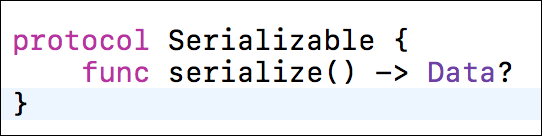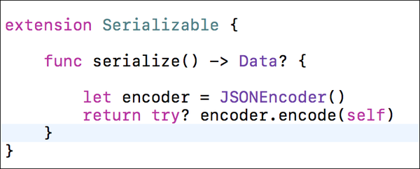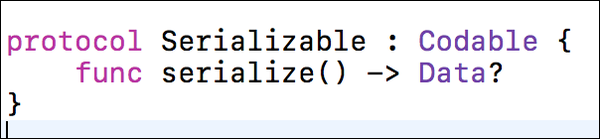 很简单吧! 我们甚至可以通过使用协议和扩展来使其更简单。 我们创建一个自定义的可序列化协议来执行编码。Serializable