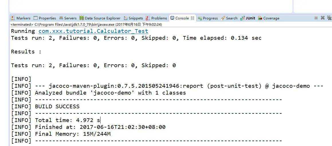 [INFO] --- jacoco-maven-plugin:0.7.5.201505241946:report (post-unit-test) @ jacoco-demo ---
