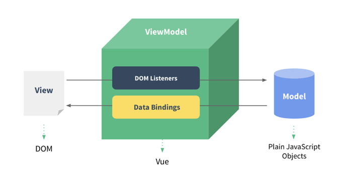 Vue 也是采用的 MVVM 模式,把数据绑定在内部处理了,对外部来说只要在 data 里声明特定的 key,在 view 里就可以直接使用,并且实时响应。对于 view 的事件,也会映射到 ViewModel 的特定方法。