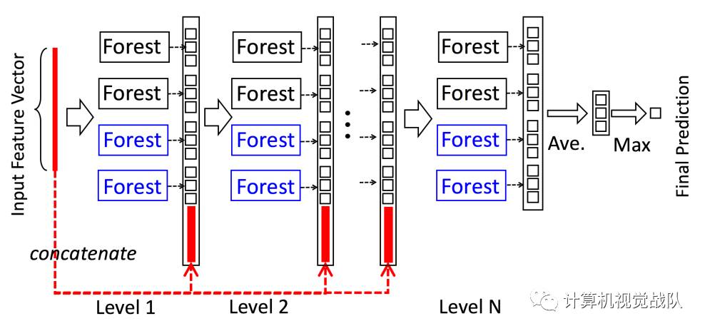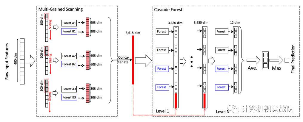 concat成一个3618-dim的原始数据,表示原始的一个数据样本,第一级的输出是12+3618=3630,后面也是一样,直到最后第N级,只有12个输出,然后在每一类别上做avg,然后输出max那一类的label,那就是最终的预测类别。