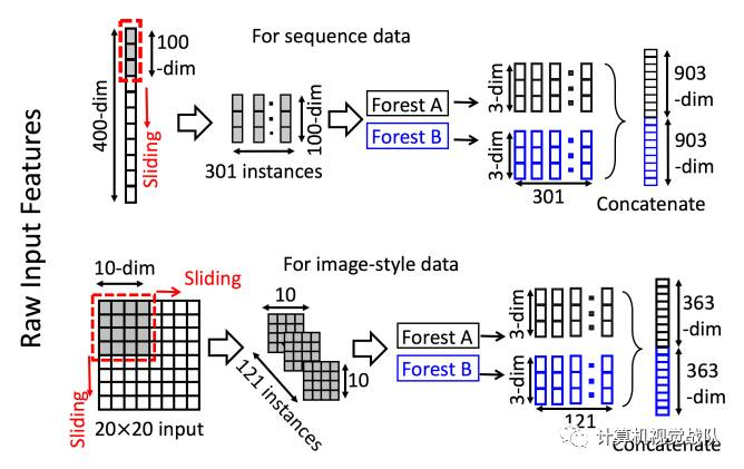 滑动窗口用于扫描原始特征。假设有400个原始特征,并且使用100个特征的窗口大小。对于序列数据,将通过滑动一个特征的窗口来生成100维的特征向量;总共产生301个特征向量。如果原始特征具有空间关系,比如图像像素为400的20×20的面板,则10×10窗口将产生121个特征向量(即121个10×10的面板)。从正/负训练样例中提取的所有特征向量被视为正/负实例;它们将被用于生成类向量:从相同大小的窗口提取的实例将用于训练完全随机树森林和随机森林,然后生成类向量并连接为转换后的像素。如上图的上半部分所示,假设有3个类,并且使用100维的窗口;然后,每个森林产生301个三维类向量,导致对应于原始400维原始特征向量的1,806维变换特征向量。