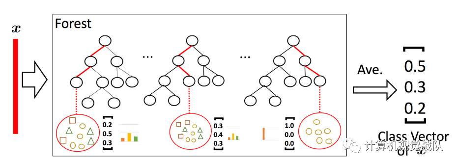 给定一个实例(就是一个样本),每个森林会通过计算在相关实例落入的叶节点处的不同类的训练样本的百分比,然后对森林中的所有树计平均值,以生成对类的分布的估计。如下图所示,其中红色部分突出了每个实例遍历到叶节点的路径。叶节点中的不同标记表示了不同的类。