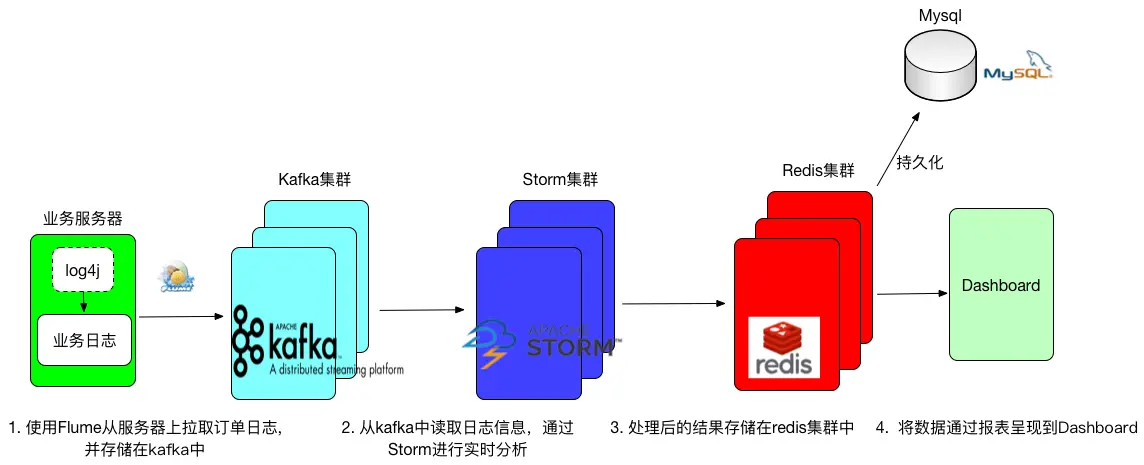 引入了Flume+Kafka+Storm来做作为班底,并继续通过Redis+Mysql的“经典”组合来做好日志数据处理后的存储。下面会分开讨论一下,选择这组班底的原因和过程中的思考。