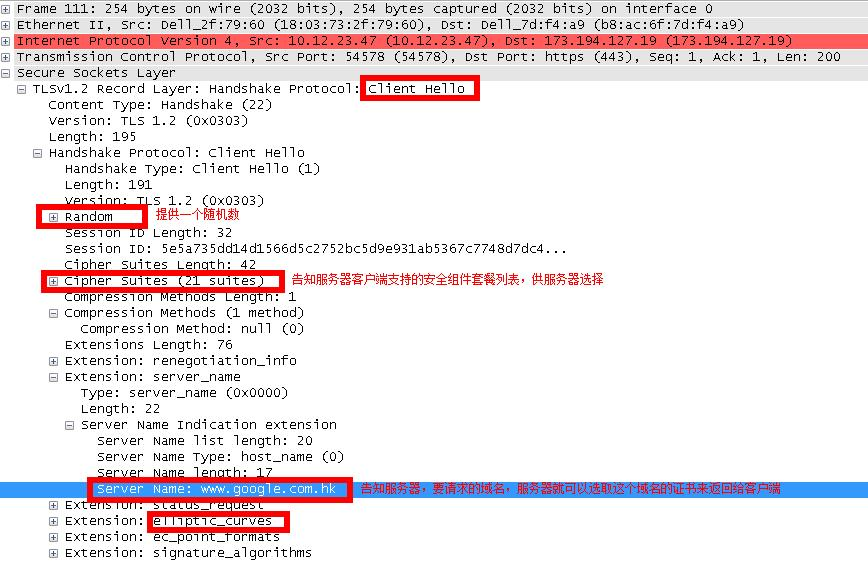 (2)选择一个安全组件套餐,本例google选择了TLS_ECDHE_RSA_WITH_AES_128_CBC_SHA
