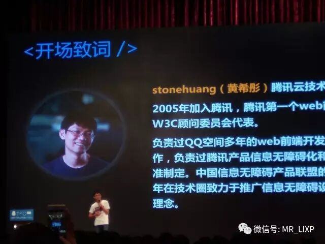 | 9:10 - 9:30 | 开场致词 | stonehuang(黄希彤) | 腾讯云技术总监,2005年加入腾讯,腾讯第一个web前端领域T4专家,W3C顾问委员会代表。负责过QQ空间多年的web前端开发和网络性能优化工作,负责过腾讯产品信息无障碍化和腾讯信息无障碍标准制定。中国信息无障碍产品联盟的联合发起人。近几年在技术圈致力于推广信息无障碍设计理念和技术公益理念。 |