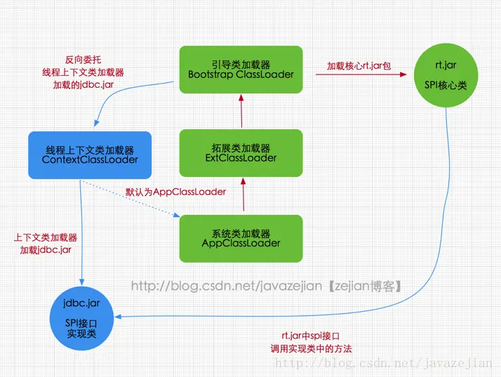在Java应用中存在着很多服务提供者接口(Service Provider Interface,SPI),这些接口允许第三方为它们提供实现,如常见的 SPI 有 JDBC、JNDI等,这些 SPI 的接口属于 Java 核心库,一般存在rt.jar包中,由Bootstrap类加载器加载,而 SPI 的第三方实现代码则是作为Java应用所依赖的 jar 包被存放在classpath路径下,由于SPI接口中的代码经常需要加载具体的第三方实现类并调用其相关方法,但SPI的核心接口类是由引导类加载器来加载的,而Bootstrap类加载器无法直接加载SPI的实现类,同时由于双亲委派模式的存在,Bootstrap类加载器也无法反向委托AppClassLoader加载器SPI的实现类。在这种情况下,我们就需要一种特殊的类加载器来加载第三方的类库,而线程上下文类加载器就是很好的选择。