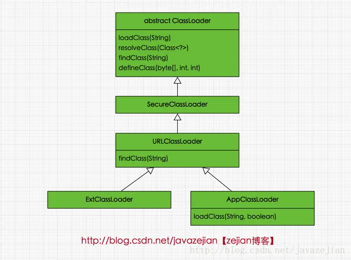 }其实无论是ExtClassLoader还是AppClassLoader都继承URLClassLoader类,因此它们都遵守双亲委托模型,这点是毋庸置疑的。ok~,到此我们对ClassLoader、URLClassLoader、ExtClassLoader、AppClassLoader以及Launcher类间的关系有了比较清晰的了解,同时对一些主要的方法也有一定的认识,这里并没有对这些类的源码进行详细的分析,毕竟没有那个必要,因为我们主要弄得类与类间的关系和常用的方法同时搞清楚双亲委托模式的实现过程,为编写自定义类加载器做铺垫就足够了。ok~,前面出现了很多父类加载器的说法,但每个类加载器的父类到底是谁,一直没有阐明,下面我们就通过代码验证的方式来阐明这答案。