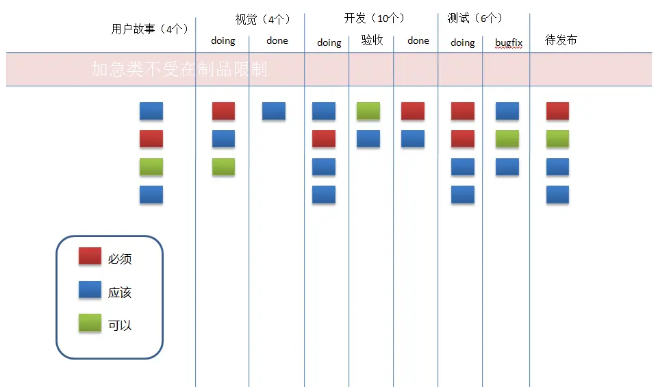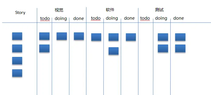 这样子,看上去比以前的看板清晰了一点,能比较清晰的知道目前视觉、软件、测试的任务情况,可惜还是存在不断的向后面推用户故事的问题,导致看板的在制品过多。