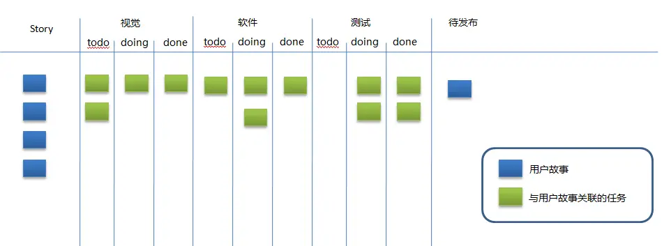要做到这些,当然就少不了一面合理的看板墙了。它是整个晨会的核心载体,晨会时,所有的项目成员都基于看板墙的信息进行讨论并更新看板墙的信息。
