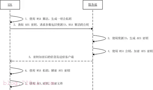 与资源文件的加密的通信流程类似,客户端 SDK 使用 RSA 加密算法,生成一对公私钥,客户端 SDK 向服务端请求 AES 密钥,服务端使用客户端 SDK请求参数中的资源 ID 查询 AES 密钥,服务端使用客户端 SDK请求参数中的 RSA 加密算法的公钥,加密AES 密钥,并且服务器发送给客户端 SDK加密后的 AES 密钥,客户端 SDK 使用RSA 加密算法的私钥解密,获取到真正的 AES 密钥,最后,客户端 SDK 使用真正的 AES 密钥对资源文件进行解密。