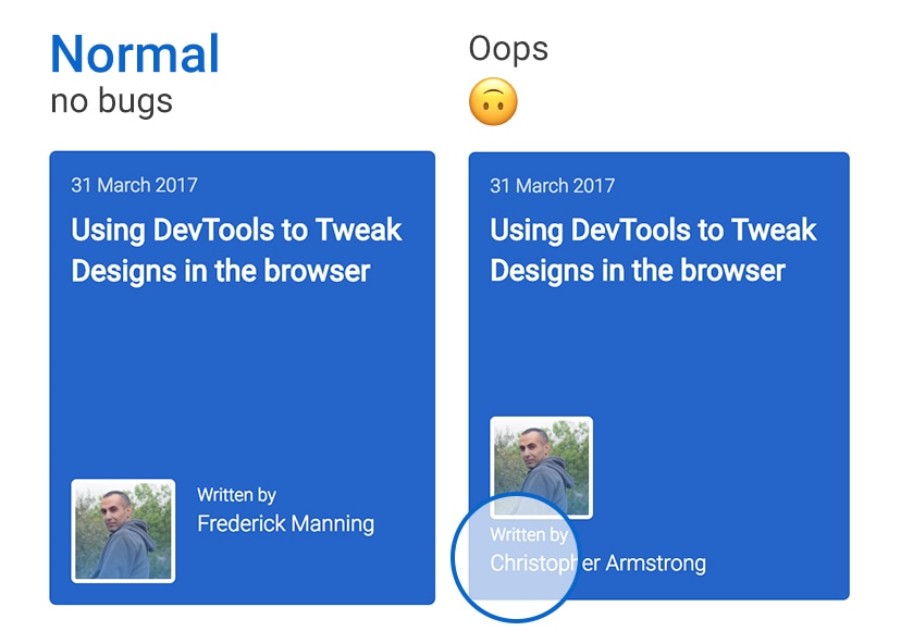 在这个设计中,图片向左浮动,右侧有作者名字的信息。当右侧的信息长度过长的时候会发生什么呢?毫无疑问布局会崩掉。