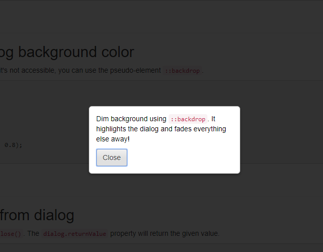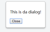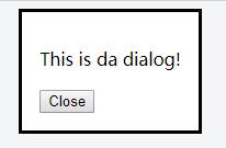 <dialog>This is da dialog!</dialog>这段 html 什么也不显示,开发者需要使用 javascript 的 API .show() 和 .close() 来控制 dialog 的显示和隐藏。