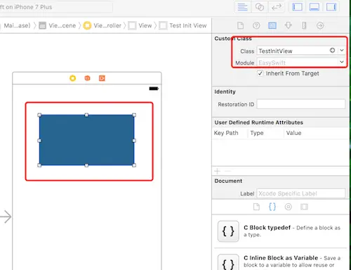 ① 使用storyBoard来构建界面,并拖入一个View,并将此View的Class设置为 TestInitView,如下: