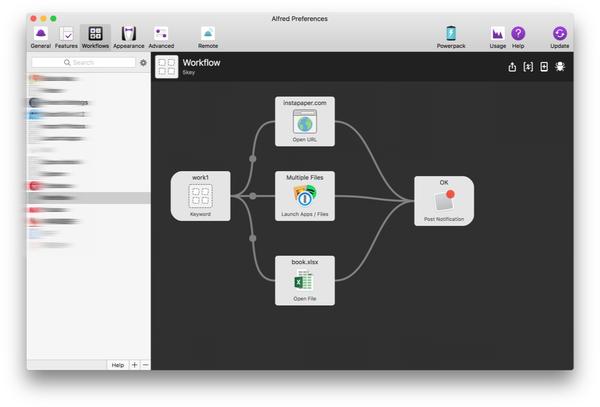 最早帮助我模拟出这个概念的工具其实是 Mac 上的快速启动神器 - Alfred,在 2.0 版本中增加的 Workflow 能够让我们通过一个指令进行一系列的操作。比如下图中用「work1」来帮助我一次性启动 Reeder、Instapaper 和一个用来做记录的 Excel。