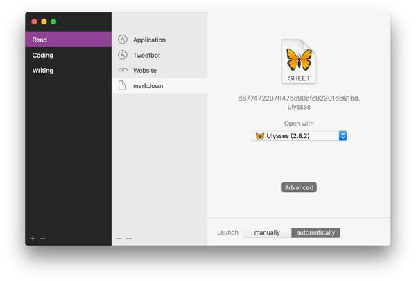 <img src="https://pic2.zhimg.com/v2-0a543a0afd3e38f7624e1e3a058b4e51_b.jpg" data-rawwidth="1734" data-rawheight="1170" class="origin_image zh-lightbox-thumb" width="1734" data-original="https://pic2.zhimg.com/v2-0a543a0afd3e38f7624e1e3a058b4e51_r.jpg">首先我们需要创建一个使用场景(比如这里的 Read),选中后会在中间栏出现操作的添加区域。应用支持 Email、终端、文件夹、应用、文件、网址 这几项操作,基本上可以覆盖到日常的使用场景。
