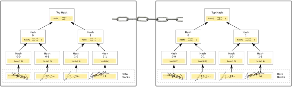 完整性(Integrity),说到区块链的一大卖点就是不可篡改,通过确定交易双方身份的Signature、交易顺序的Merkel Hash tree、Block前向完整性(Forward integrity)Hash,三者(如图)组成了一套完整的分布式账本链条,其中每一条、每一页的交易记录之间、页与页之间都由密码学原语保护。这样的一种数据结构设计,为区块链带来了更灵活的去中心结算方案。