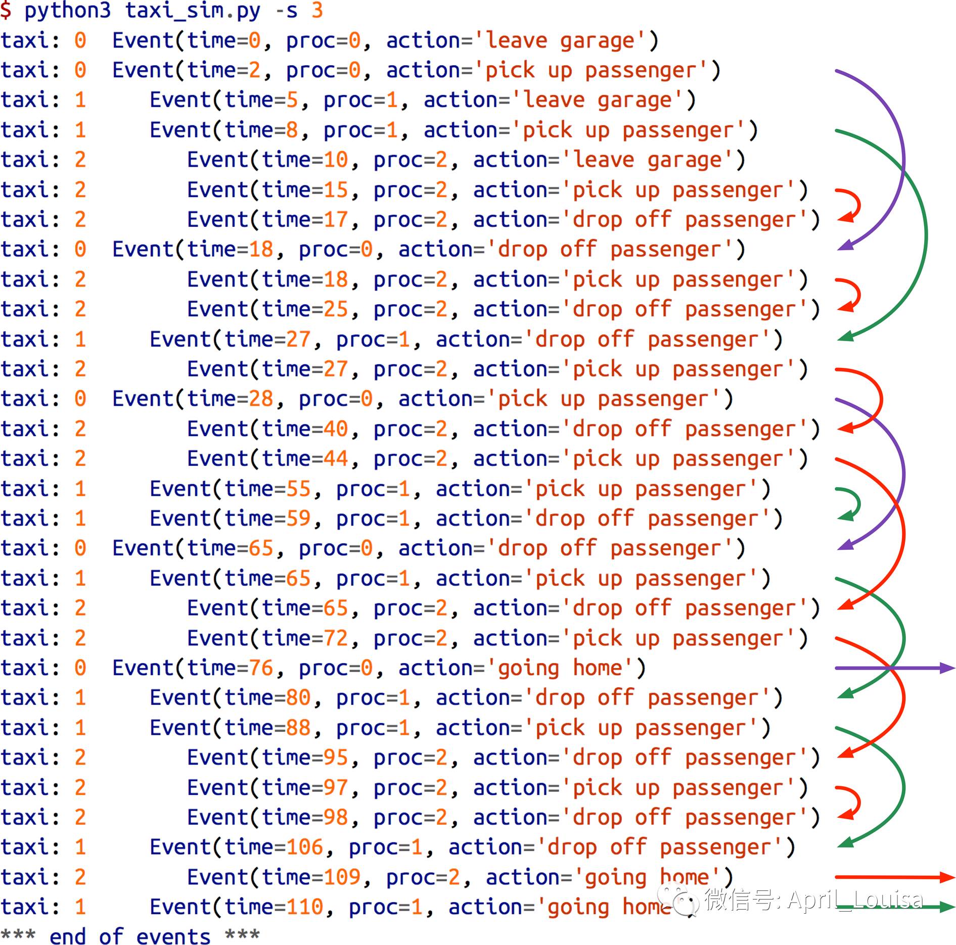 # time 是事件发生的仿真时间,proc 是出租车进程实例的编号,action是描述活动的字符串