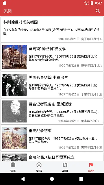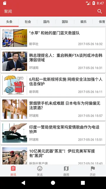 - TabHost + Fragment 作为主界面结构,实现“资讯”,“笑话”,“趣图”,“历史上的今天”四个模块