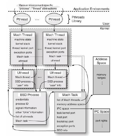 任务(task)是一种容器(container)对象,虚拟内存空间和其他资源都是通过这个容器对象管理的,这些资源包括设备和其他句柄。严格地说,Mach 的任务并不是其他操作系统中所谓的进程,因为 Mach 作为一个微内核的操作系统,并没有提供“进程”的逻辑,而只是提供了最基本的实现。不过在 BSD 的模型中,这两个概念有1:1的简单映射,每一个 BSD 进程(也就是 OS X 进程)都在底层关联了一个 Mach 任务对象。