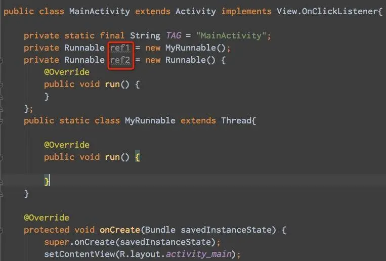 this$0这个引用指向MainActivity.this,也就是说当前的MainActivity实例会被ref2持有,如果将这个引用再传入一个异步线程,此线程和此Acitivity生命周期不一致的时候,就会造成Activity的泄漏。