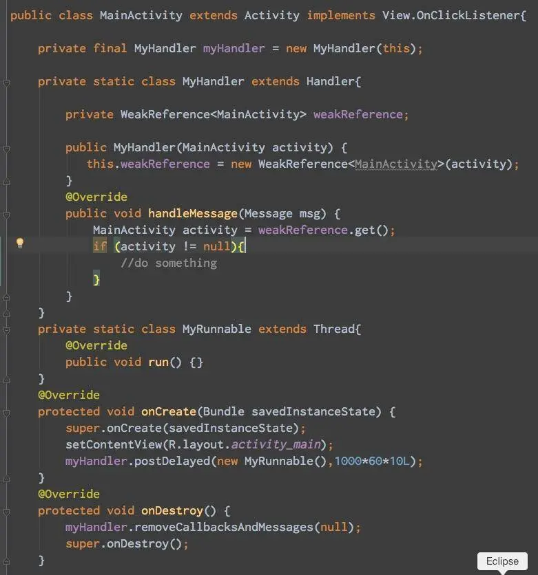 修复方法:在 Activity 中避免使用非静态内部类或匿名内部类,比如将 Handler 声明为静态的,则其存活期跟 Activity 的生命周期就无关了。如果需要用到Activity,就通过弱引用的方式引入 Activity,避免直接将 Activity 作为 context 传进去。另外, Looper 线程的消息队列中还是可能会有待处理的消息,所以我们在 Activity 的 Destroy 时或者 Stop 时应该移除消息队列 MessageQueue 中的消息。见下面代码: