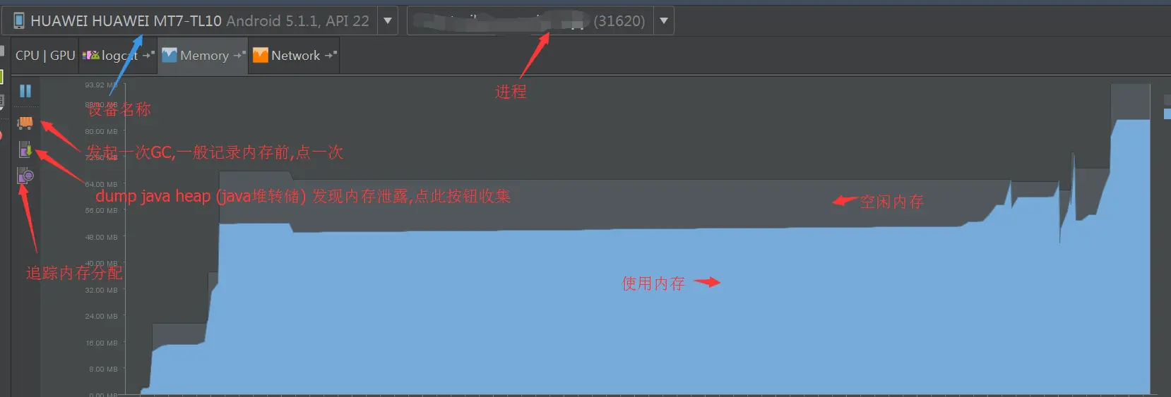 }运行项目,并执行以下操作:进入TestActivity,然后退出,再重新进入,如此操作几次后,最后最终退出TestActivity。这时发现,内存持续增高,如图所示: