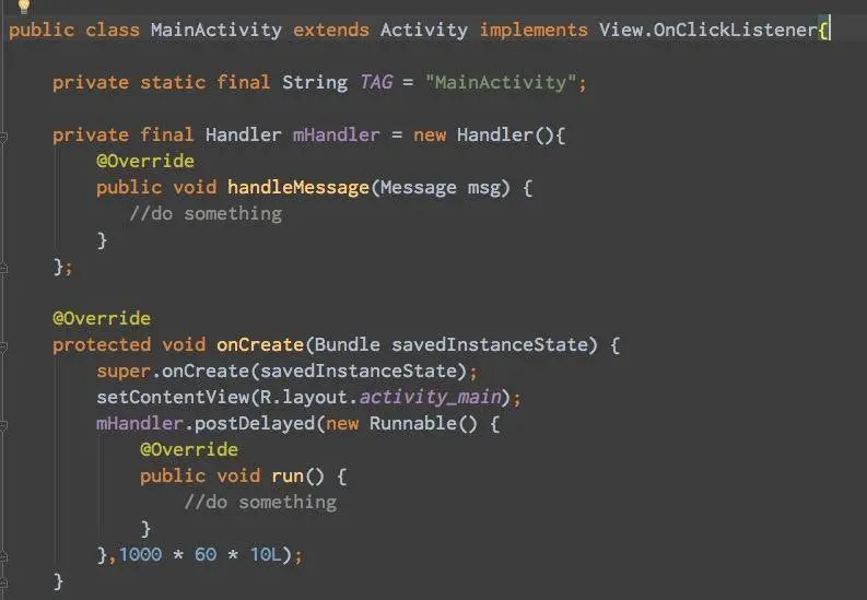 在该MainActivity 中声明了一个延迟10分钟执行的消息 Message,mHandler 将其 push 进了消息队列 MessageQueue 里。当该 Activity 被 finish() 掉时,延迟执行任务的 Message 还会继续存在于主线程中,它持有该 Activity 的 Handler 引用,然后又因 为 Handler 为匿名内部类,它会持有外部类的引用(在这里就是指MainActivity),所以此时 finish() 掉的 Activity 就不会被回收了,从而造成内存泄漏。