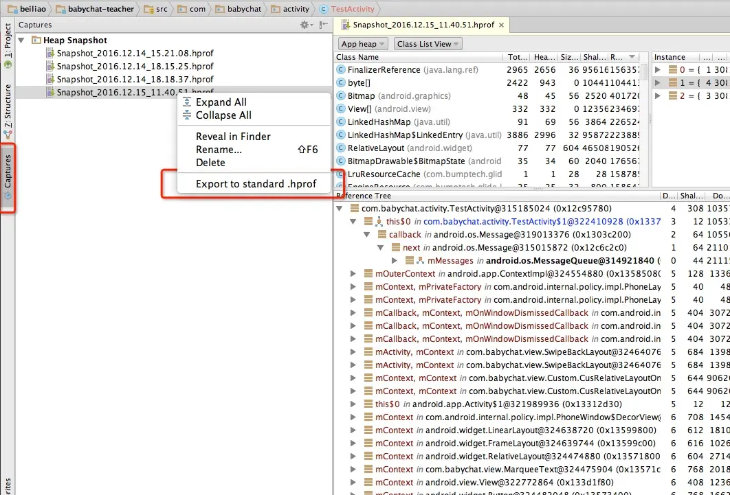如上图所示,Android studio提示有3个TestActivity对象可能出现了内存泄漏。而且左边的Reference Tree(引用树),也大概列出了该实体类被引用的路径。如果是一些比较简单的内存泄漏情况,仅仅看这里就大概能猜到是哪里导致了内存泄漏。