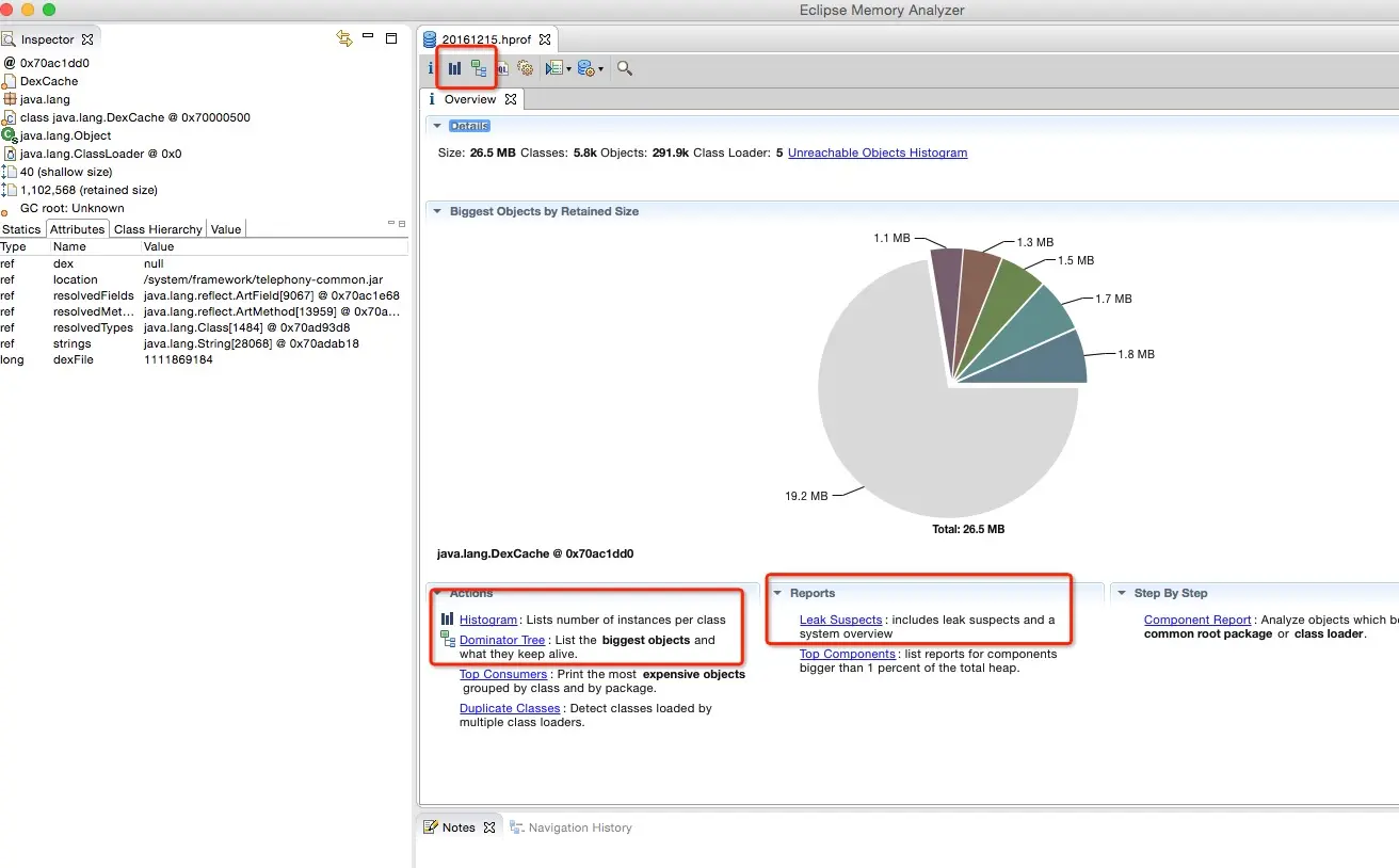 MAT中提供了非常多的功能,这里我们只要学习几个最常用的就可以了。上图那个饼状图展示了最大的几个对象所占内存的比例,这张图中提供的内容并不多,我们可以忽略它。在这个饼状图的下方就有几个非常有用的工具: