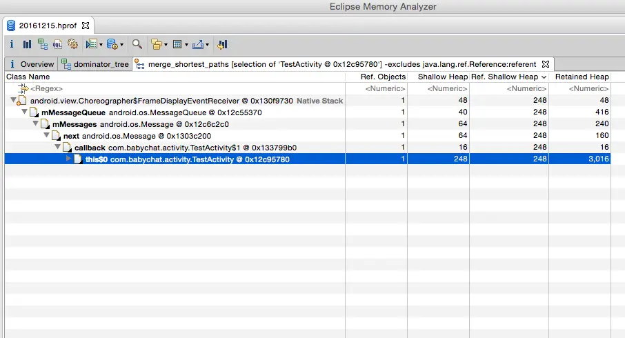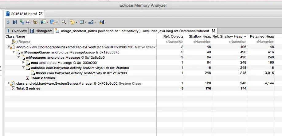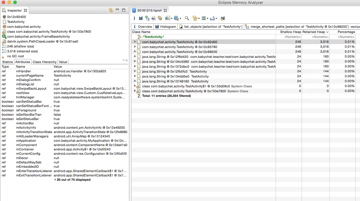 从上图可以看出,我们搜出了3个TestActivity的对象,一般在退出某个activity后,就结束了一个activity的生命周期,应该会被GC正常回收才对的。通常情况下,一个activity应该只有1个实例对象,但是现在居然有3个TestActivity对象存在,说明之前的操作,产生了3个TestActivity对象,并且无法被系统回收掉。
