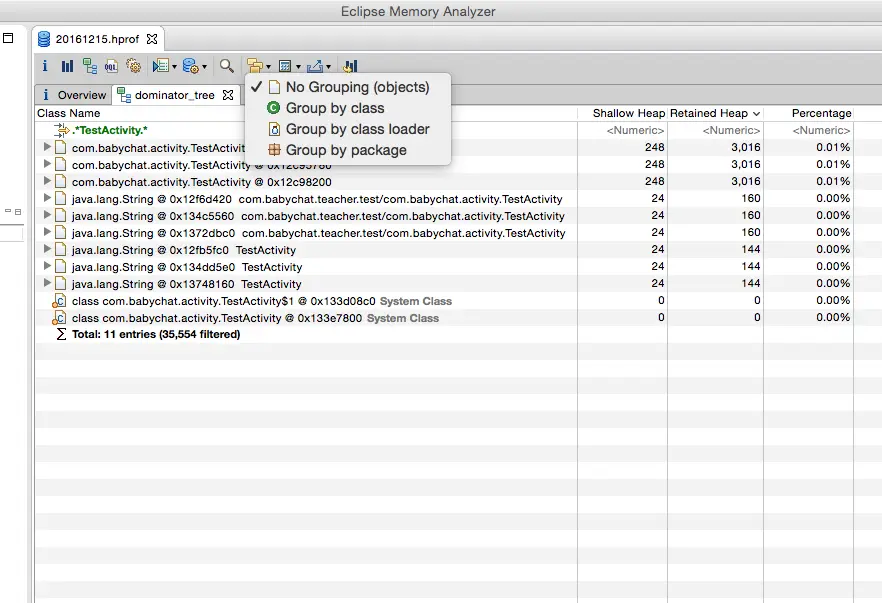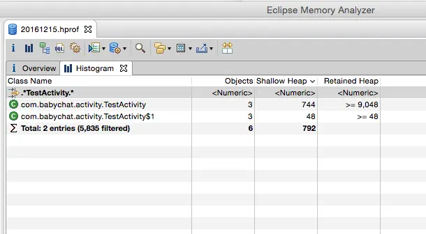 Histogram中是可以显示对象的数量的,比如说我们现在怀疑TestActivity中有可能存在内存泄漏,就可以在第一行的正则表达式框中搜索“TestActivity”,如下所示: