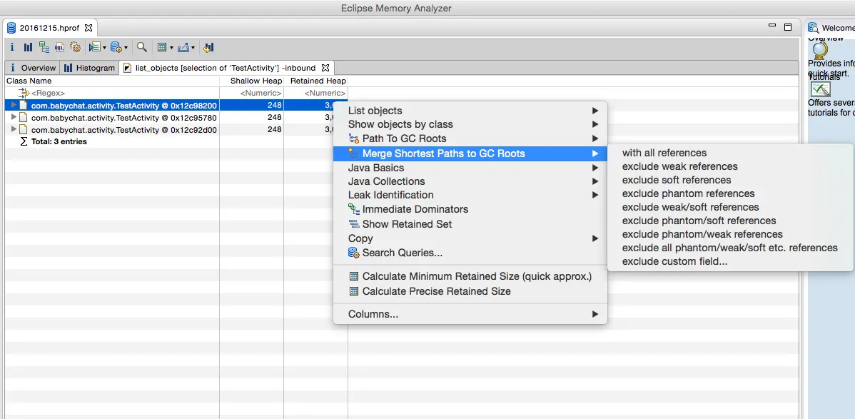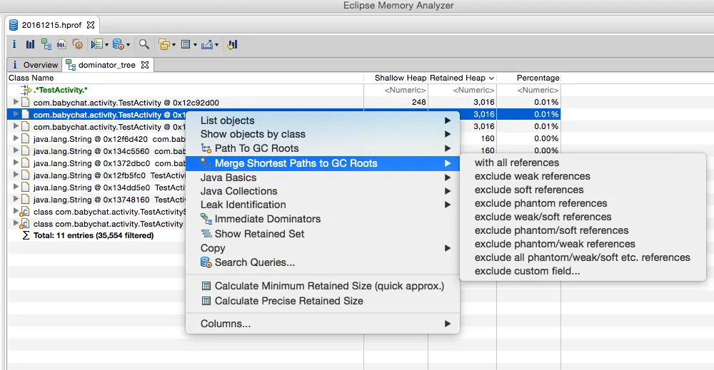 对着TestActivity对象点击右键 -> Merge Shortest Paths to GC Roots(当然,这里也可以选择Path To GC Roots) -> exclude all phantom/weak/soft etc. references