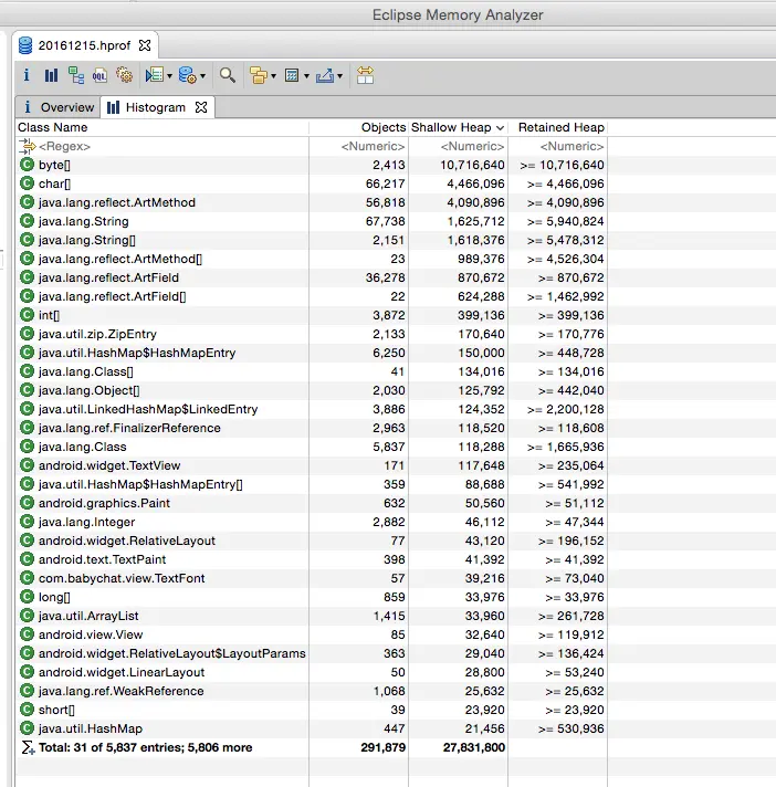 从上图可以看到右边存在着3个参数。Retained Heap表示这个对象以及它所持有的其它引用(包括直接和间接)所占的总内存,因此从上图中看,前两行的Retained Heap是最大的,分析内存泄漏时,内存最大的对象也是最应该去怀疑的。