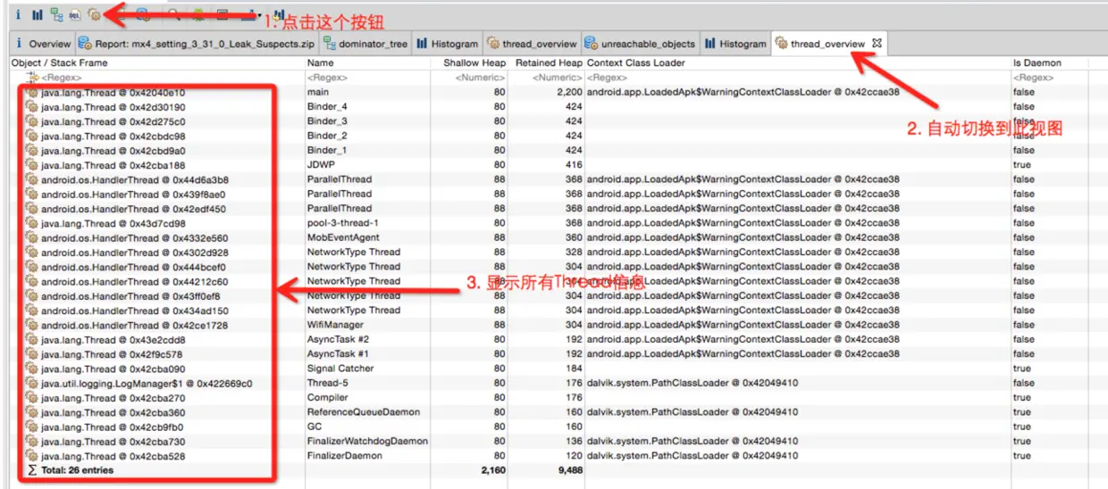 在这里先提醒一下:MAT并不会准确地告诉我们哪里发生了内存泄漏,而是会提供一大堆的数据和线索,我们需要根据自己的实际代码和业务逻辑去分析这些数据,判断到底是不是真的发生了内存泄漏。
