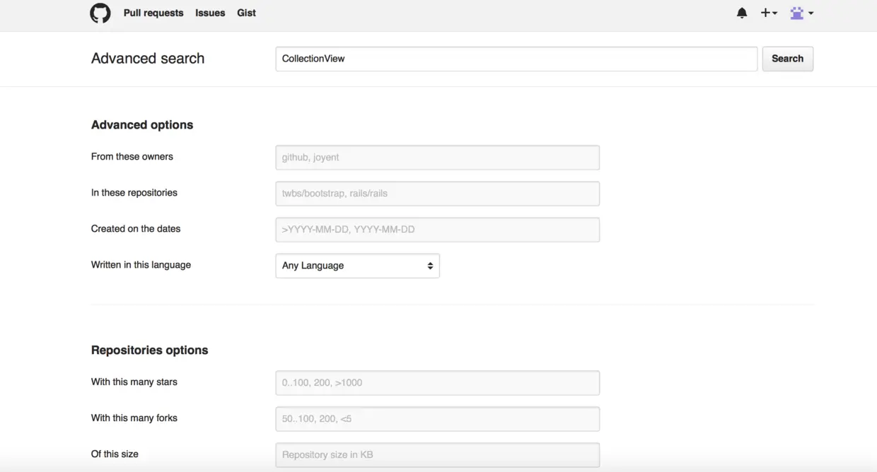 下面是两种搜索词的结果对比。搜索“collectionView” 搜索“CollectionView OR UICollectionView OR collection” - 在上图中,我们可以看到左侧边栏的下方有两个可点击的选项 Advanced search 和 Cheat sheet,点击 Advanced search 即可进行自定义条件的高级搜索了,点击 Cheat sheet 则可以查看一些有关搜索的帮助信息。