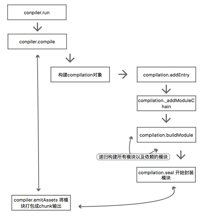 那么compiler和compilation是如何完成编译构建的?其实看了事件钩子罗列大概就对webpack的构建流程有点眉目了,我们顺着事件钩子来大致理一理webpack的工作方式。