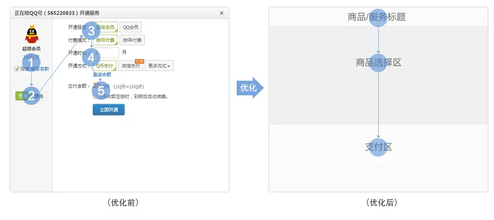 原来版面商品信息和支付信息混杂一起,影响用户处理效率。改版后按照用户的路径“选商品→支付商品”,重新进行信息分区,优化用户视觉动线,提高处理效率。