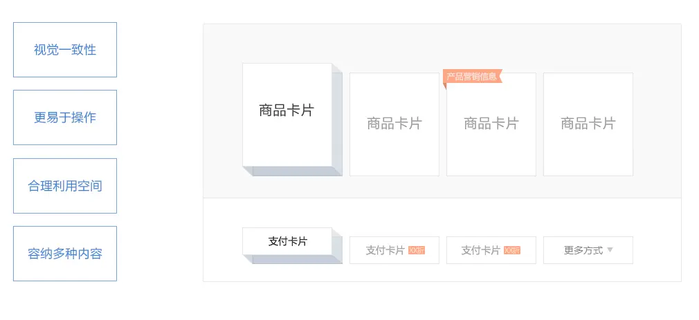 在主要信息的表现中,合理利用空间,将单个内容信息打包,采用卡片式展示,能给用户带来更好的视觉一致性,易于操作,也能有效的对同类信息进行了区分,同时卡片式的展示方式弄够更好的容纳多种内容,便于多种业务模式复用。
