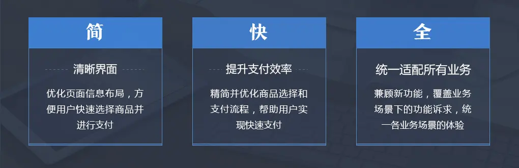 作为支持多种业务模式的支付方案,统一各业务场景下的体验尤为重要,使其适用于多种业务,各种屏幕,同时减少开发的成本。