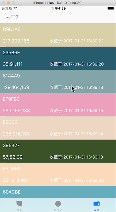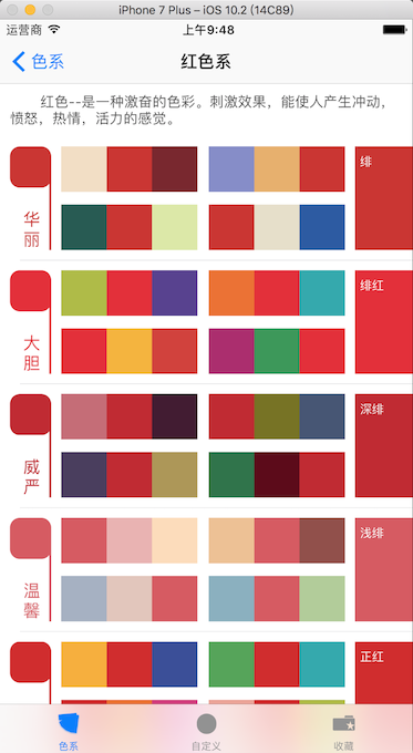 大家可能也看到了,这是个很简单的App,无非就是几个列表展示下分类的颜色和收藏的颜色,担心功能太单一,所以又添加了自定义色。下面我们来讲 项目 Demo吧。