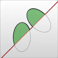 如上图例所示,画布上有一条对角线,中间有两个椭圆弧被对角线切开(x radius = 30, y radius = 50)。第一个椭圆弧的x-axis-rotation(x轴旋转角度)是0,所以弧形所在的椭圆是正置的(没有倾斜)。在第二个椭圆弧中,x-axis-rotation设置为-45,所以这是一个旋转了45度的椭圆,并以短轴为分割线,形成了两个对称的弧形。参看图示中的第二个椭圆形。