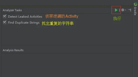 打开Analyzer Tasks后,可以发现有2个选项和一个按钮,说明如下图所示,我们需要的就是第一个"Detect Leaked Activities"。