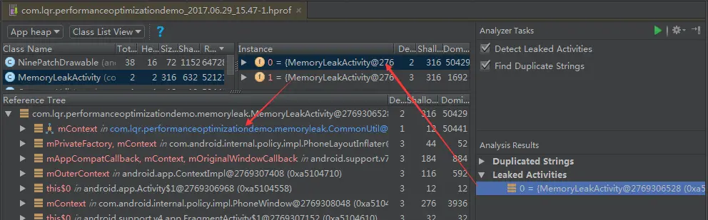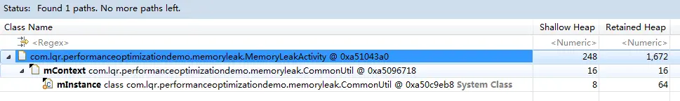 简单分析下就知道了,第一个MemoryLeakActivity实例是泄漏的,引用它的对象就是CommonUtil。