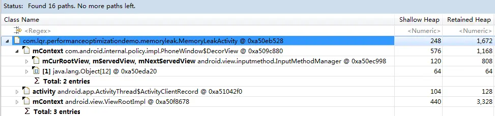 出来的结果有2大块,即对内存中的2个MemoryLeakActivity实例分别被引用的结果进行了分类,可以看到每个MemoryLeakActivity都被好多个对象引用了。