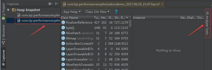 打开一个内存快照(.hprof文件),Android Studio的右侧会出现Analyzer Tasks。