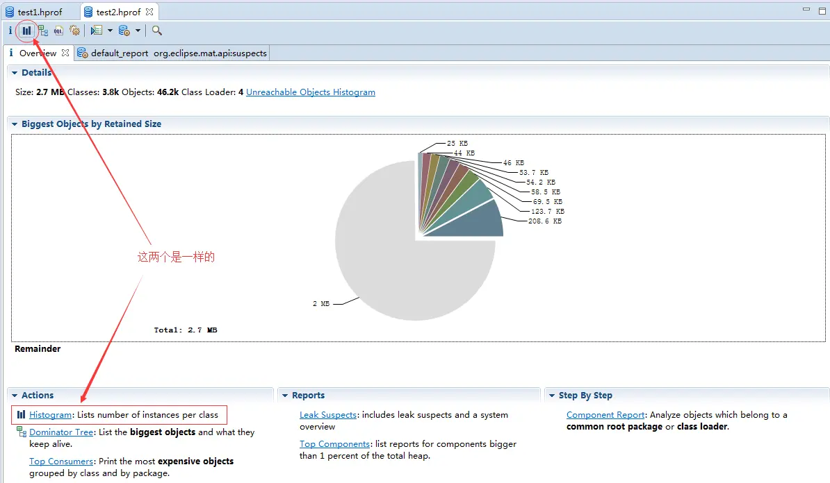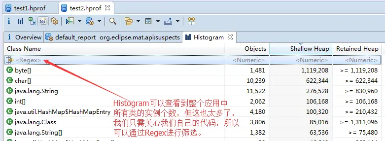 切换到test2.hprof,打开Histogram。
