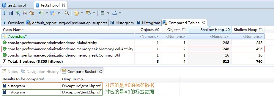 分别将test1.hprof和test2.hprof的histogram添加到Compare Basket,详细操作如下图所示。