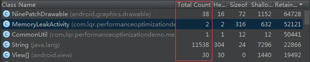 一样,我们只关心我们自己的代码,所以通过Regex进行筛选。通过数据分析,可以知道,在旋转屏幕前后,MemoryLeakActivity的实例由1增加到了2,又因为test2.hprof是在执行了GC后获取的,所以可以判定MemoryLeakActivity在旋转屏幕后,内存泄漏了。